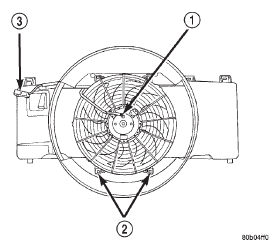 (3) Lift fan straight up and out of vehicle. INSTALLATION (1) Align lower retaining tabs of fan shroud with